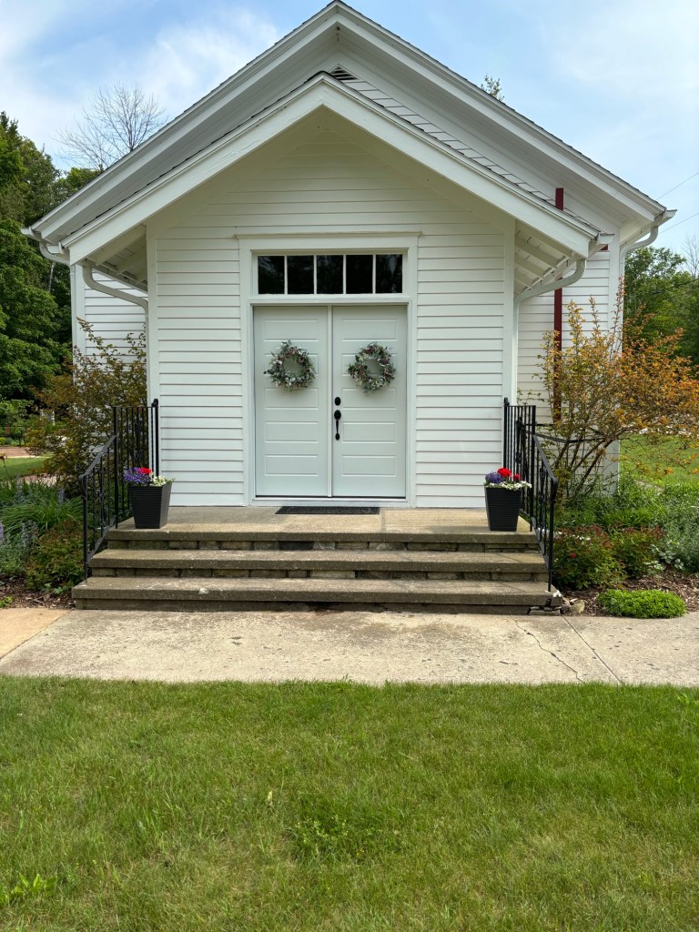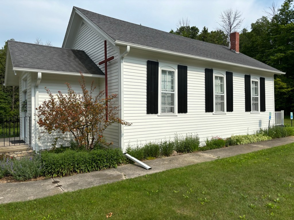 A shed in the back was added in the 2000’s, and then a well was sunk. The church had 4 electrical outlets installed and the stove was replaced with a propane stove. In the 2010’s, sidewalks around the building were built to access a new brick patio with brick benches used for after church fellowship, 5 memorial trees were planted. New upholstery was accomplished for the pew pads. In the entrance foyer, storage cabinets with white wainscoting were built for extra chairs and supplies. Rain gutters were installed around the roof to direct rainwater away from the foundation.