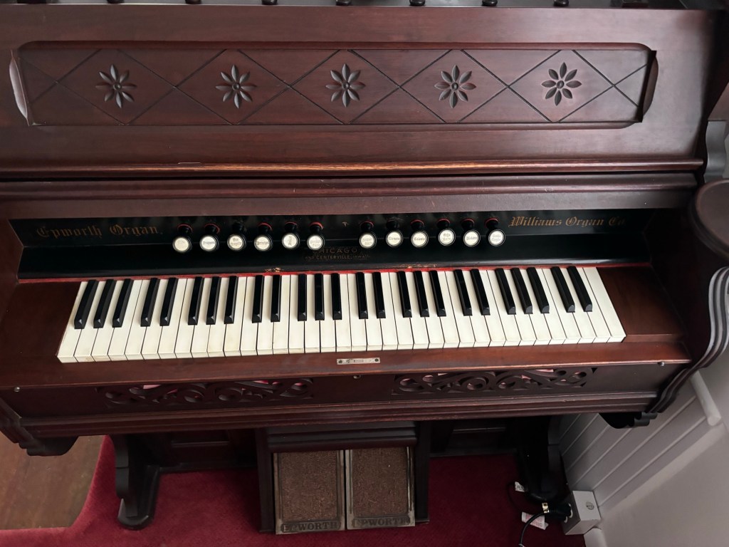 This Epworth organ was found through its registration number to be manufactured by the Williams Organ Co in 1892 or 1893. It is registered with the Reed Organ Society.